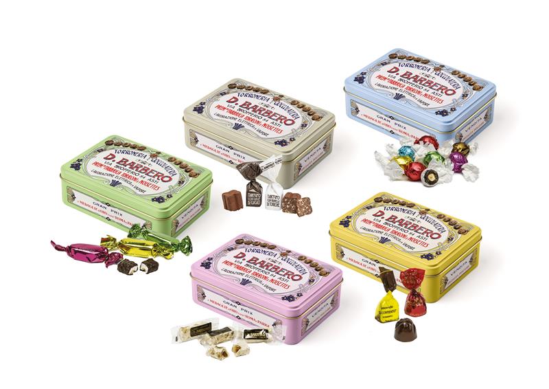 De roze met kruimelige nougatstukjes, de groene met kruimelige nougatstukjes bedekt met pure chocolade, de gele met kersen-, hazelnoot- en limoncello bonbons, het blauwe met cri cri chocolade en het crèmekleurig blikje met de twee soorten tartufi van Davide Barbero (met nougat en met cacao)